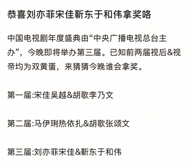 跟着刘亦菲封后音信传出,85花款式又发生了新的转变,其实刘亦菲奖运一直都比较差,加上自身近几年才启动转型电视咖,但在这之前,《梦华录》提名飞天、白玉兰、金鹰奖,和《去有风的场合》相同,都拿遍了最好电视剧提名大满贯,刘亦菲就差一个主流奖的最好女主。