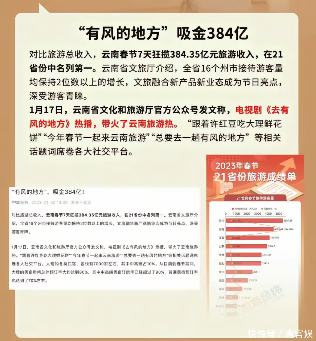 在刘亦菲关系授奖词词中,提到了一个文旅破钞皆集,也辗转确认了“刘亦菲效应”,就拿《去有风的场合》来说,这部剧带火了云南文旅,以致许多明星网红带头打卡,刘亦菲功不行没,和男主角的爱情线让云南这个场合充满了文艺气味。