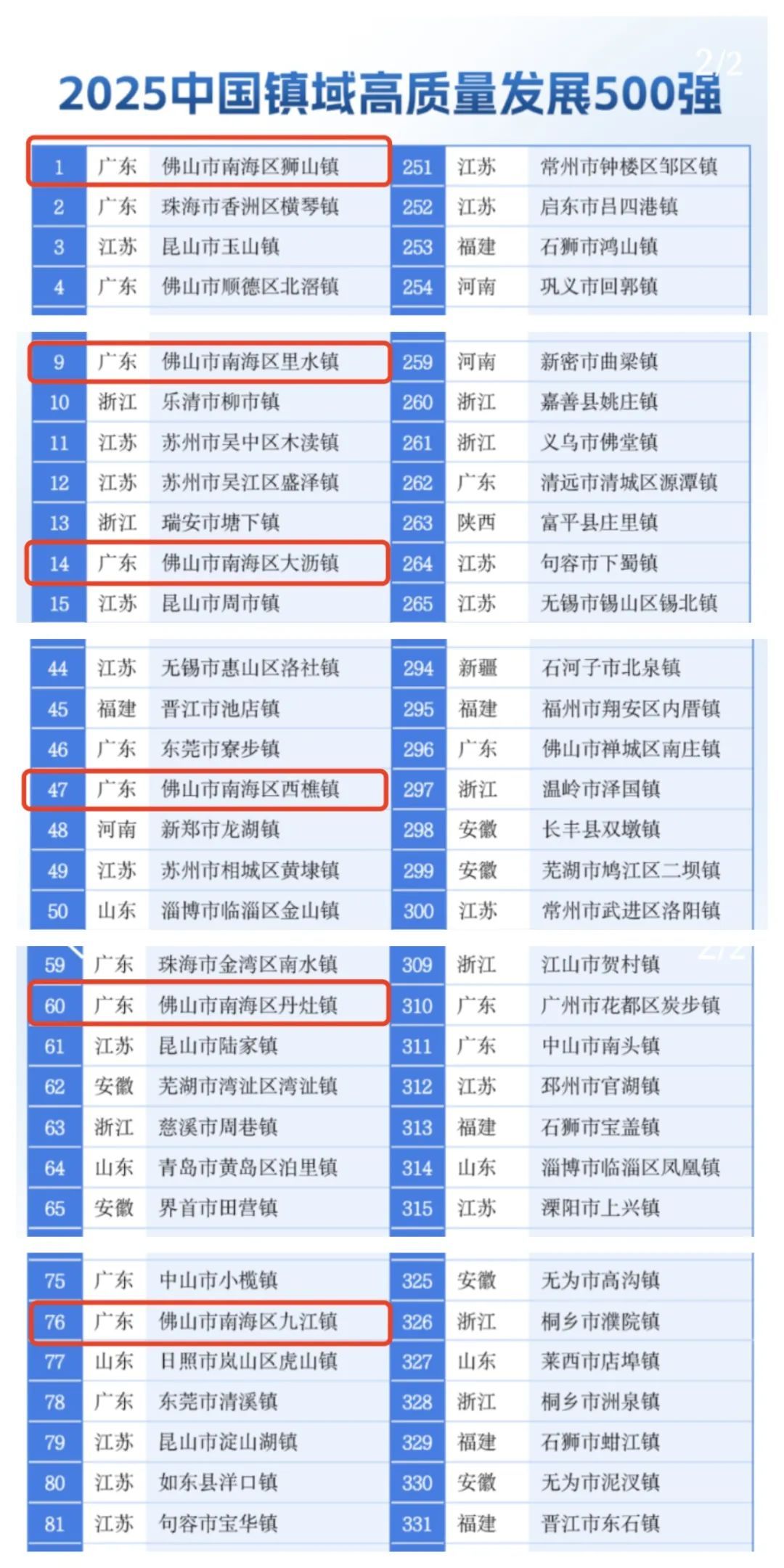 南海区狮山镇、里水镇、大沥镇、西樵镇、丹灶镇、九江镇入选2025中国镇域高质料发展500强前100位。