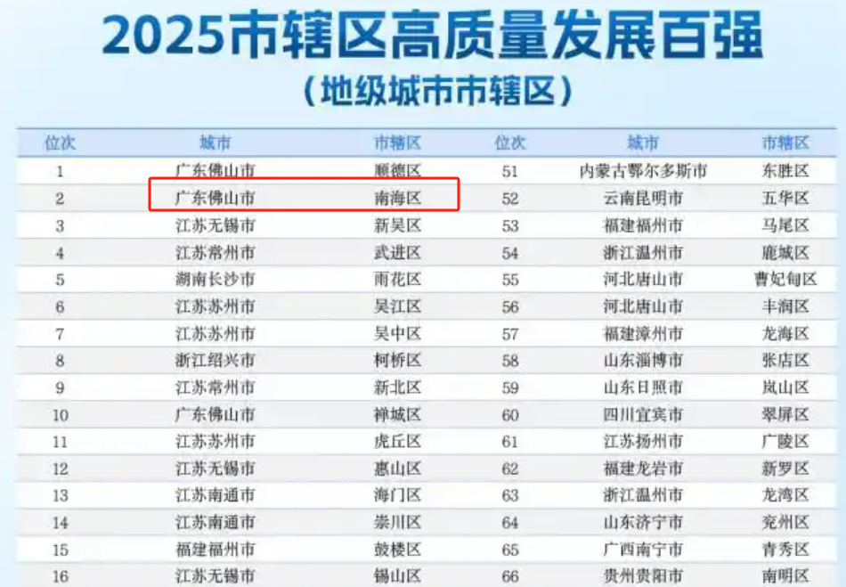 南海区位居2025地级市市辖区高质料发展百强第二位。