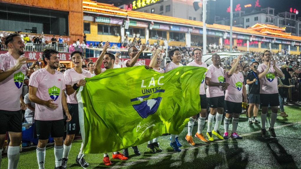 9月28日,驻华支吾官代表队队员们在球场边庆祝。当日,“发现中国之好意思·相约贵州村超”外洋友谊赛在贵州省黔东南苗族侗族自治州榕江县的“村超”足球场举行。24名驻华支吾官与当地“村超”球队进行了一场外洋友谊赛。新华社记者 陶亮 摄