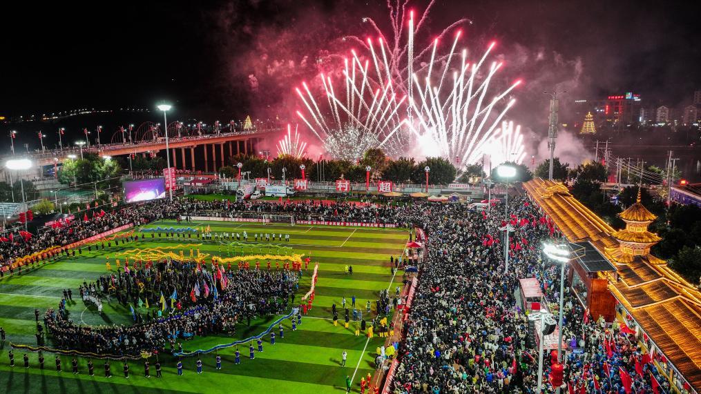 2024天下“村晚”示范展示活动暨贵州“村超村晚”在贵州省黔东南苗族侗族自治州榕江县拉开帷幕。这是音乐烟花秀在“村晚”演出(2024年2月3日)。新华社记者 刘续 摄