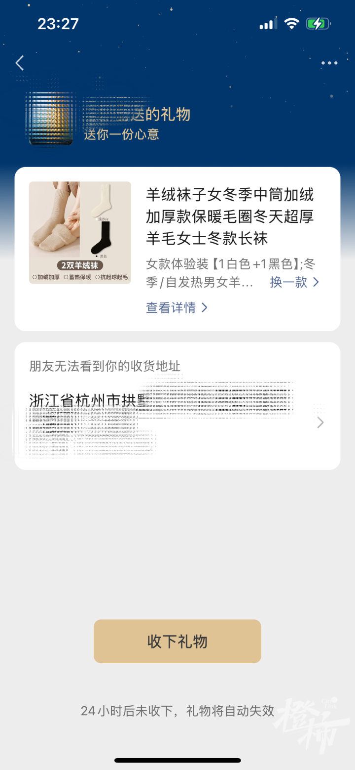 接管礼物后,订单就会出现时右下角“我”页面的“订单与卡包”里。礼物不救助转赠,礼物送出后,岂论是否接管,有用期为24小时,超时径直退款。