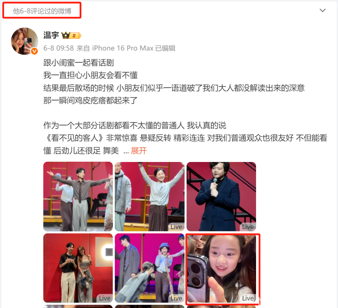 6月8日,董璇犬子的闺蜜发文共享了她不雅看话剧《看不见的宾客》不雅后感及相片,夸赞董璇犬子看认识了这个话剧的本体,辗转等于说董璇犬子夸了张维伊的饰演好。而张维伊也十分牛逼的回报了这条博文,在评述区关怀邀约下一场相遇。