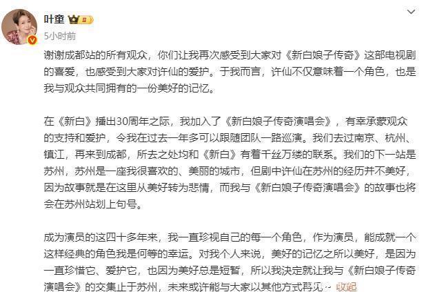 今天凌晨,叶童发文称决定不再参与《新白娘子听说演唱会》: