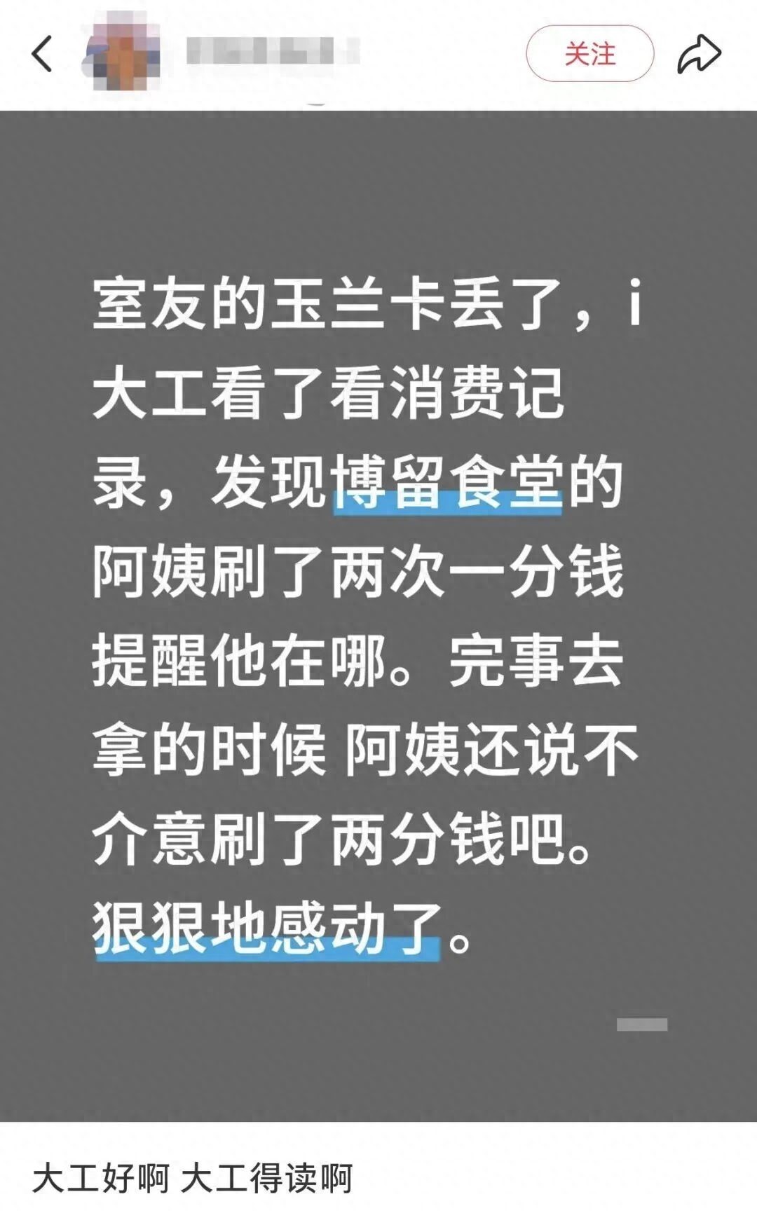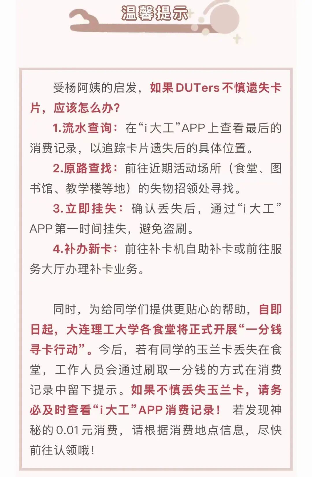 “是怎样念念到这个妙招的?”杨大姨说:“学生来吃饭遗失玉兰卡的事情频频发生。咱们捡到的第一时分就会放到食堂的失物招领处赞助起来,便捷学生来认领。但学生不一定知谈卡丢在了那儿,凭据往时的职责教诲,我就念念到用刷一分钱的情势提醒学生。跟司理商榷后,一致以为这成见可行,就运转这样作念了。”受杨大姨的启发,为给同学们提供更贴心的匡助,大连理工大学发文称:自即日起,大连理工大学各食堂将细腻开展“一分钱寻卡步履”。今后,若有同学的玉兰卡丢失在食堂,职责主谈主员和会过刷取一分钱的情势在倏地记载中留住领导。