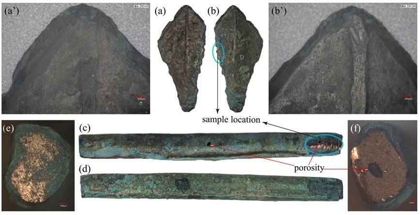 商榷团队通过金相检会、微区身分分析、元素分析及铅同位素分析等科学妙技,阐发两件器物均为铜锡铅三元合金铸件。检测暴露,铅含量分歧为9%和12%,锡含量分歧为3%和5%,还含微量的银、砷、锌等多种金属元素。“较多的杂质元素标明原料应是径直使用多金属共生矿冶真金不怕火而成,响应出早期冶金时间的原始特征。”商榷团队靳松安西宾先容。