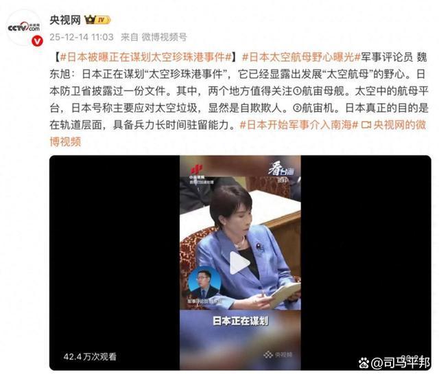 高市早苗不仅染指台海,还企图抢走垂钓岛,以致将南千岛群岛和独岛的主权问题推到台前,日方念念暂劳永逸,将中俄韩得罪了个遍。不仅如斯,高市早苗还要给自保队、核刀兵松捆,更调侃的是,日本的贪念依然不限于地球,以致要将魔爪伸向天际。
