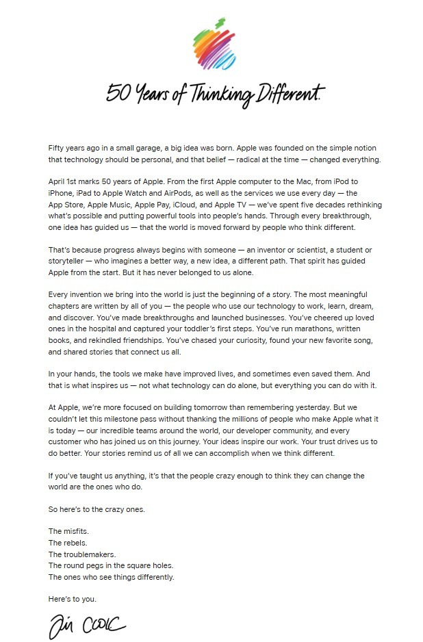 3月13日音问,跟着4月1日的邻近,Apple行将迎来竖立50周年的珍藏里程碑。本日,苹果公司首席执行官Tim Cook发布了一封题为《50 Years of Thinking Different》的公开信,归来公司发展过程,并向大家用户抒发感谢。