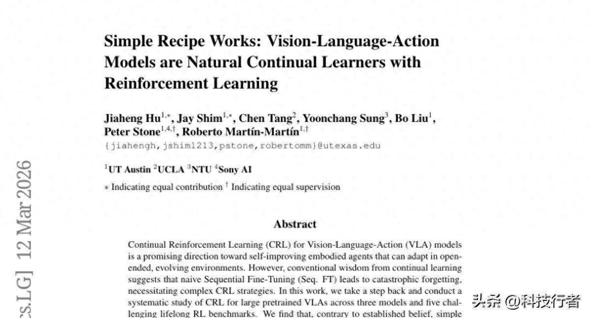 这项由德克萨斯大学奥斯汀分校指导,结伙UCLA、南洋理工大学以及Sony AI共同进行的商榷,发表于2026年的机器学习顶级期刊,展现了一个令东谈主惊喜的发现:当咱们用最粗浅径直的方法老师大型机器东谈主时,它们果然能够学会新妙技而不健忘旧妙技。故意思意思深入了解的读者不错通过论文编号"arXiv:2603.11653v1"查询完整论文。